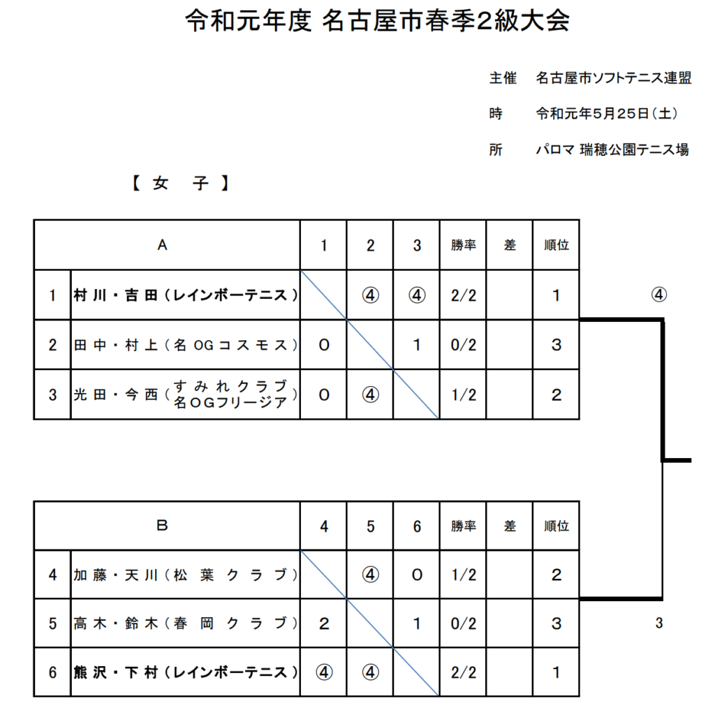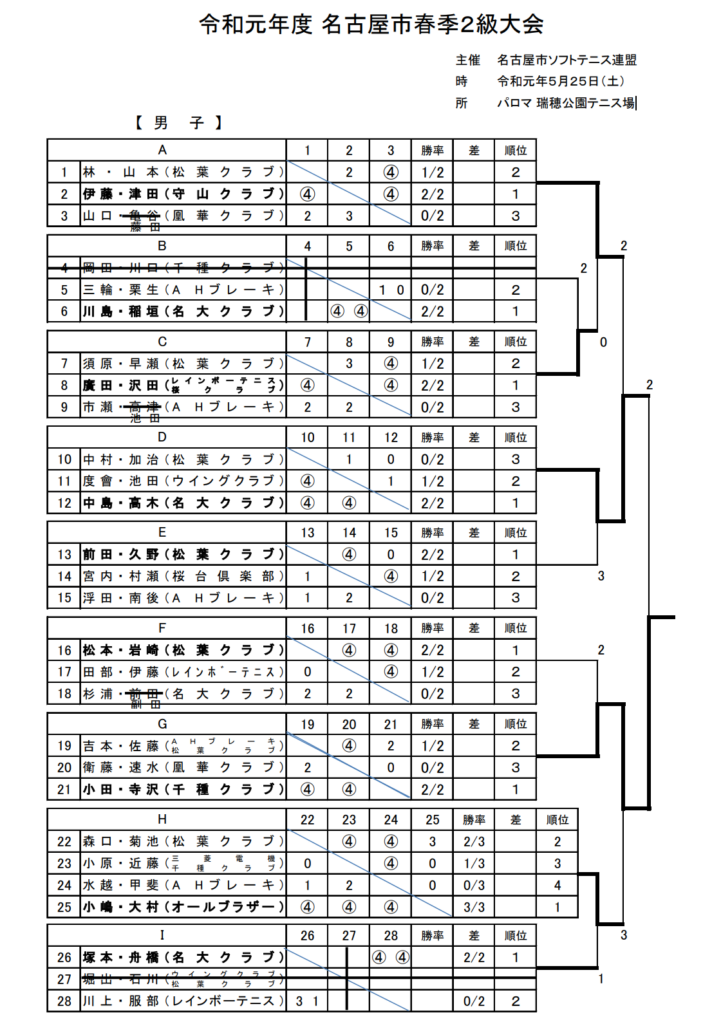 2019度春季2級大会が5月25日(土)、パロマ瑞穂公園テニスコートで開催されました。成績は以下の通りです。