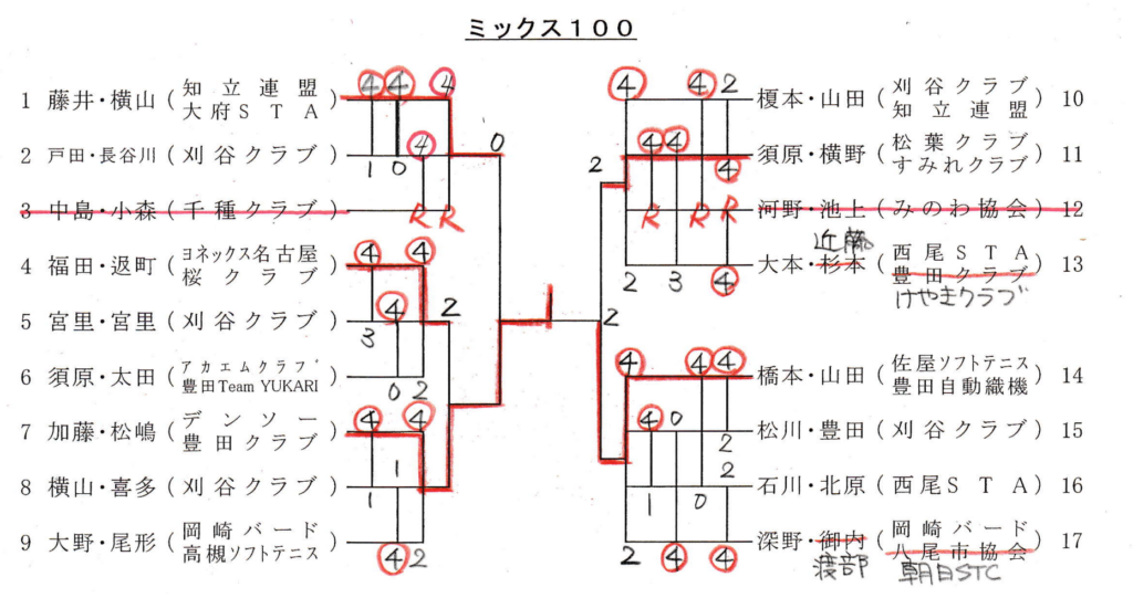 順延していた第5回名古屋オープンミックス大会が6月12日(日)、パロマ瑞穂テニスコートで開催されました。成績は以下の通りです。
